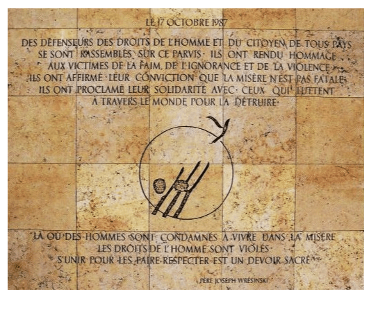 « Le 17 octobre 1987, des défenseurs des droits de l’homme et du citoyen de tous pays se sont rassemblés sur ce parvis. Ils ont rendu hommage aux victimes de la faim, de l’ignorance et de la violence. Ils ont affirmé leur conviction que la misère n’est pas fatale. Ils ont proclamé leur solidarité avec ceux qui luttent à travers le monde pour la détruire.»